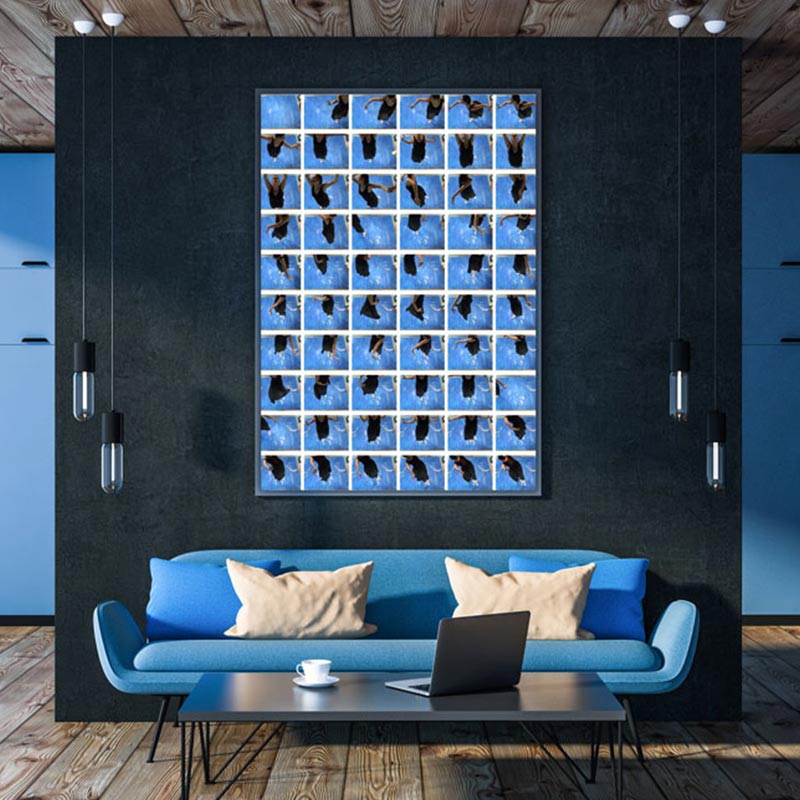 The creation process of an artwork is a vital component for understanding and appreciating the art. We grant access to the entire process and provide insight into our techniques, choreographies, approach, and materials. The art print collection features aerial shots of the original artwork framed behind acrylic glass, while its animated version is turned into NFTs, featured on Allbum.art.