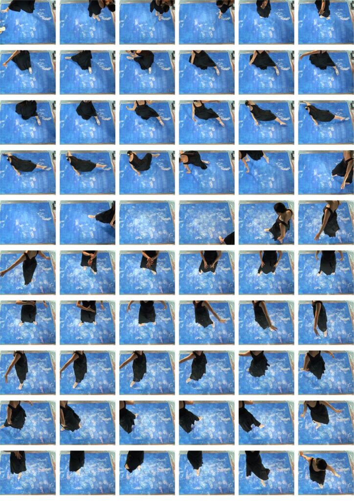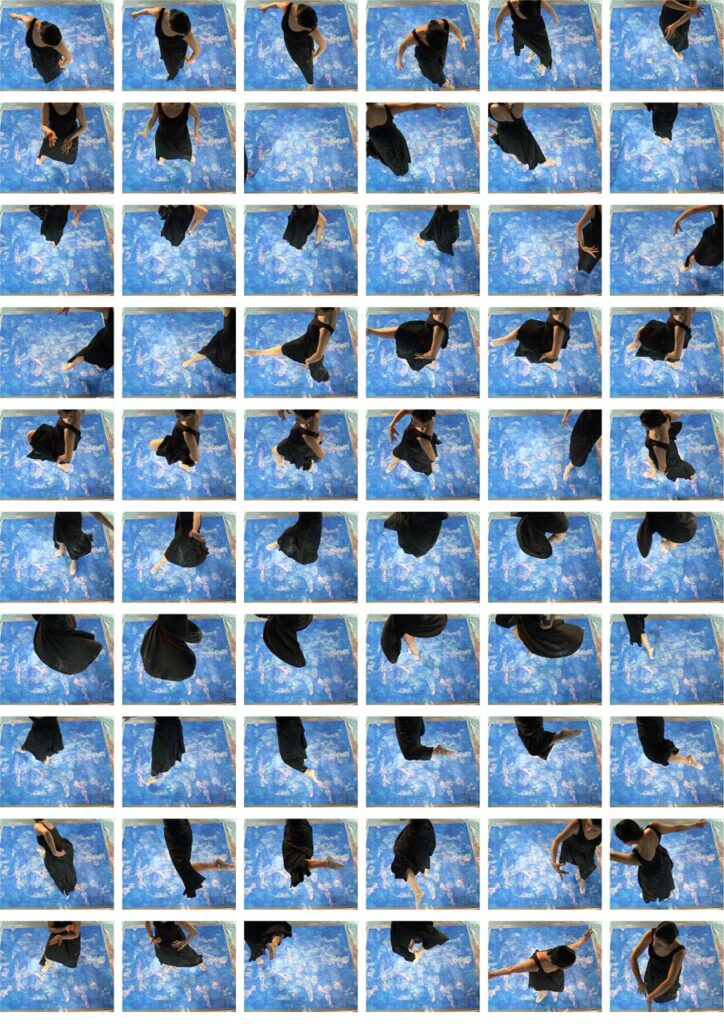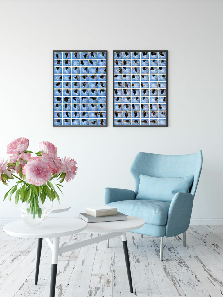 The original artwork paired with its art prints, expands the creative horizon while nurturing artistic authenticity and minimalism. In addition to the original artwork on canvas, a set of photographic art prints can be acquired as stunning accompaniment, available in our shop and displayed behind acrylic glass. These so called contact sheets were created by capturing the footage of our dancer’s steps and movements, all shot through a video camera attached to a crane and later edited and chosen carefully in post-production. The award-winning photography shows living creations with movement, where each frame portrays the lifecycle of the artwork collection.
