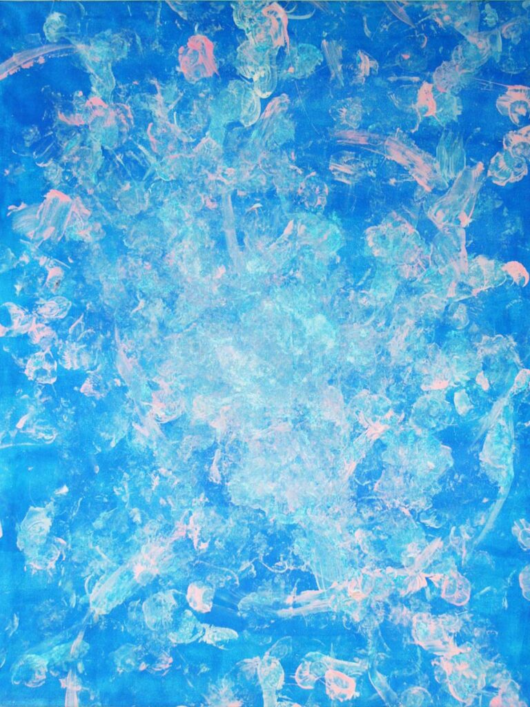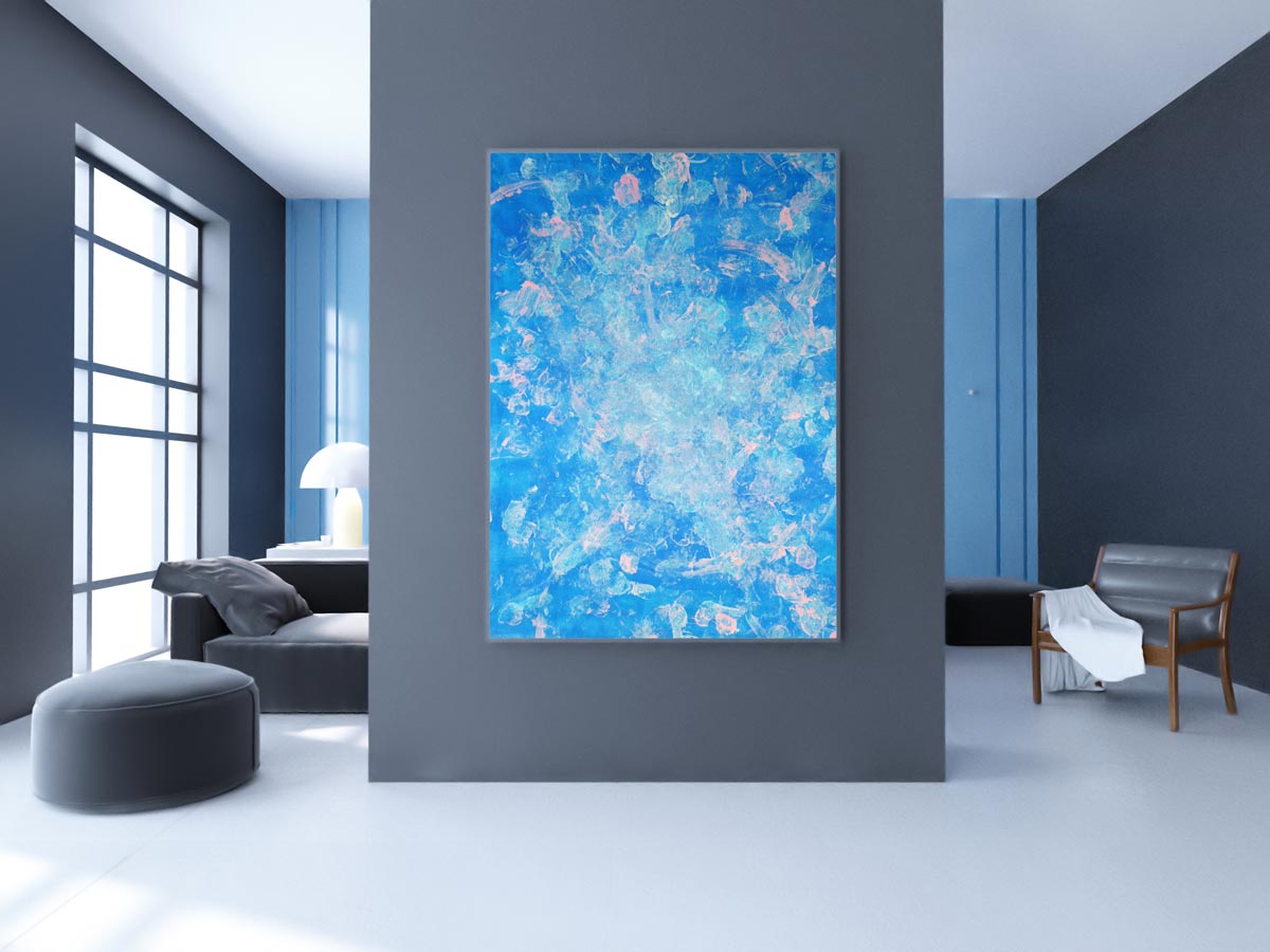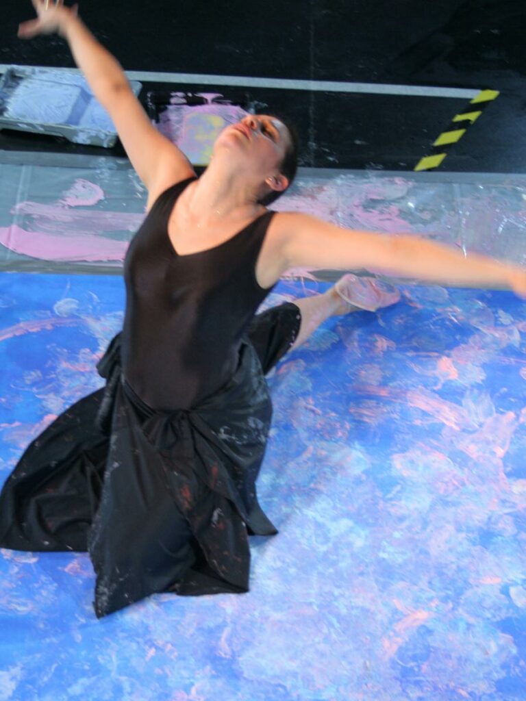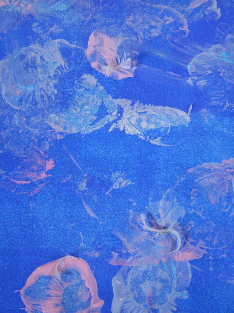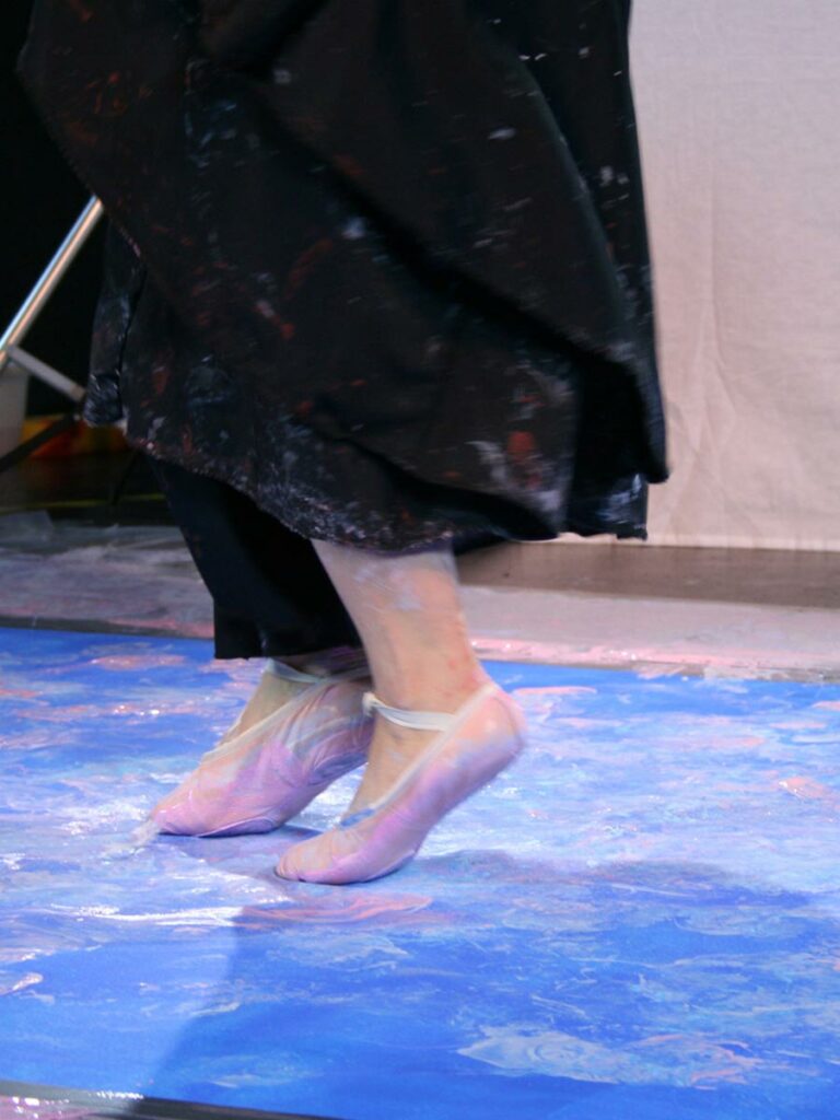 While some areas show the ballerina’s entire shoe, other areas display partial prints together with feathers in a breathtaking color composition. These minor details combined with the dynamic movements of our elegant ballerina, draw the audience closer to the artwork and capture their attention. The outcome is a unique artwork full of contrasts between vibrant base colors and delicate footsteps, leading to fascinating abstract patterns, which resemble a marriage of Yves Klein’s and Jackson Pollock’s masterpieces. The magic of dance and movement is captured and immortalized in this artwork, acting as a reminder of the simplest joys of life.