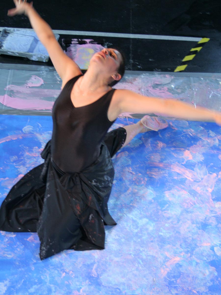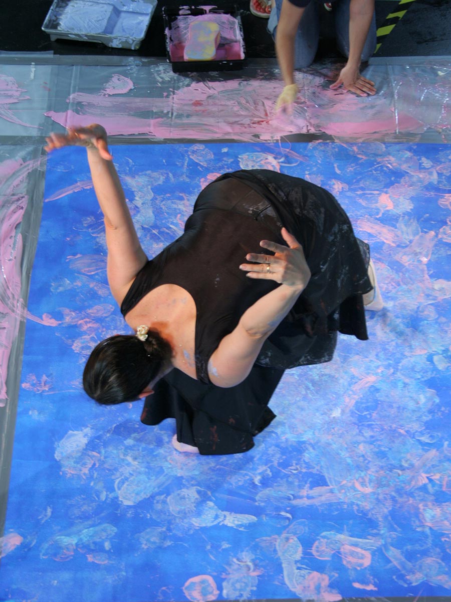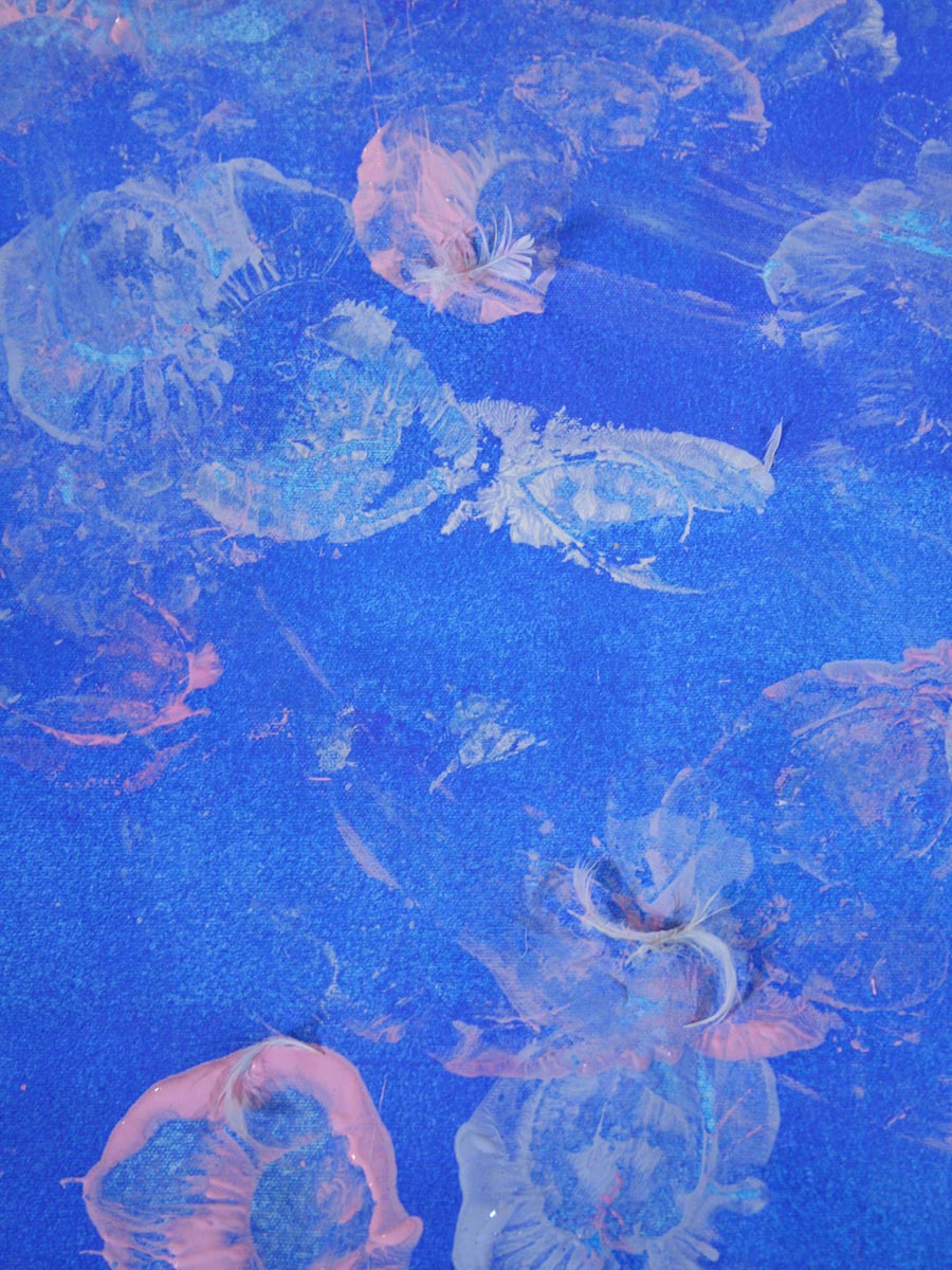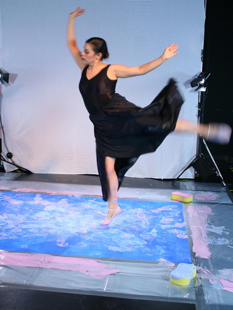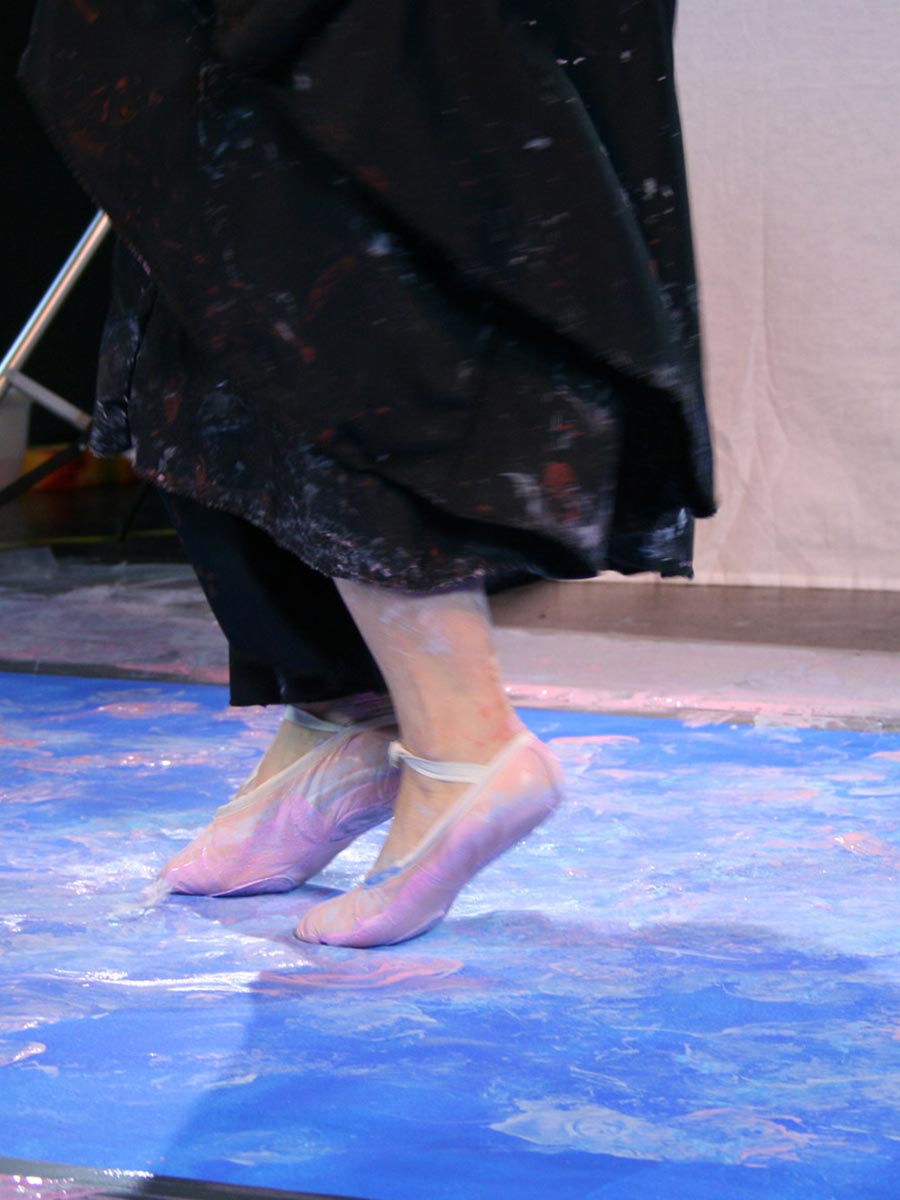 Our ballerina Adriana Garza Coeto, ballet dancer and teacher became our human brush in this masterpiece, performing live in front of an audience in the UK. Her theatrical expressions were captured on camera during her performance and did this dance justice. Each footprint was captured on a blue base, representing the lake in the first act of the ballet Swan Lake. Some footsteps show the dancer circling around the canvas, while others melt with the base color. Adriana our ballerina brought feathers with her, which she used as part of her performance. These randomly fell on the canvas and stuck to the tempera paint.
