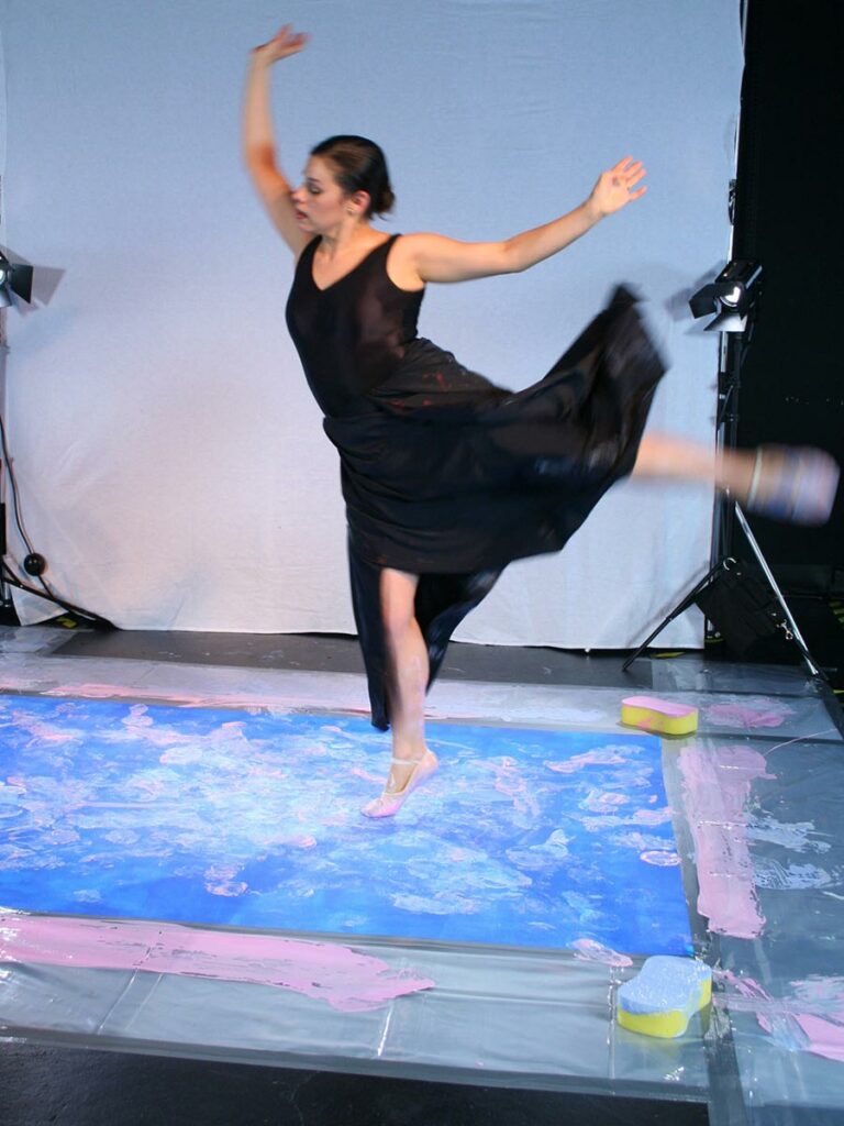 In one frame, you will see the dancer circling freely with her flowing skirt around the canvas, and in another, she is small and almost not to spot. These details draw the viewer immediately into the art and capture their attention. The contrast between the canvas’ vibrant colors and the dancer’s movement results in incredible design patterns, as well as dramatic and stunning visuals.