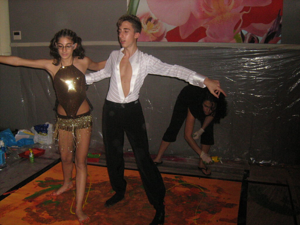 Our young and talented dancers from a local dance school, became our human brushes in this masterpiece, performing live in front of an audience at the restaurant 1902 in Milan. Their extensive training brought us stunning theatrical expressions that were captured on camera during their performance and did the Ruma justice. Each footprint was captured on a yellow base, representing the shining sun of Cuba, while other vivid colors such as violet and pink melted with the base color. Sanaz decided spontanesouly to add some gold glitter tempera to the artwork, resembling parts of our female dancer’s costume, which turned finally into a harmonious color mix.