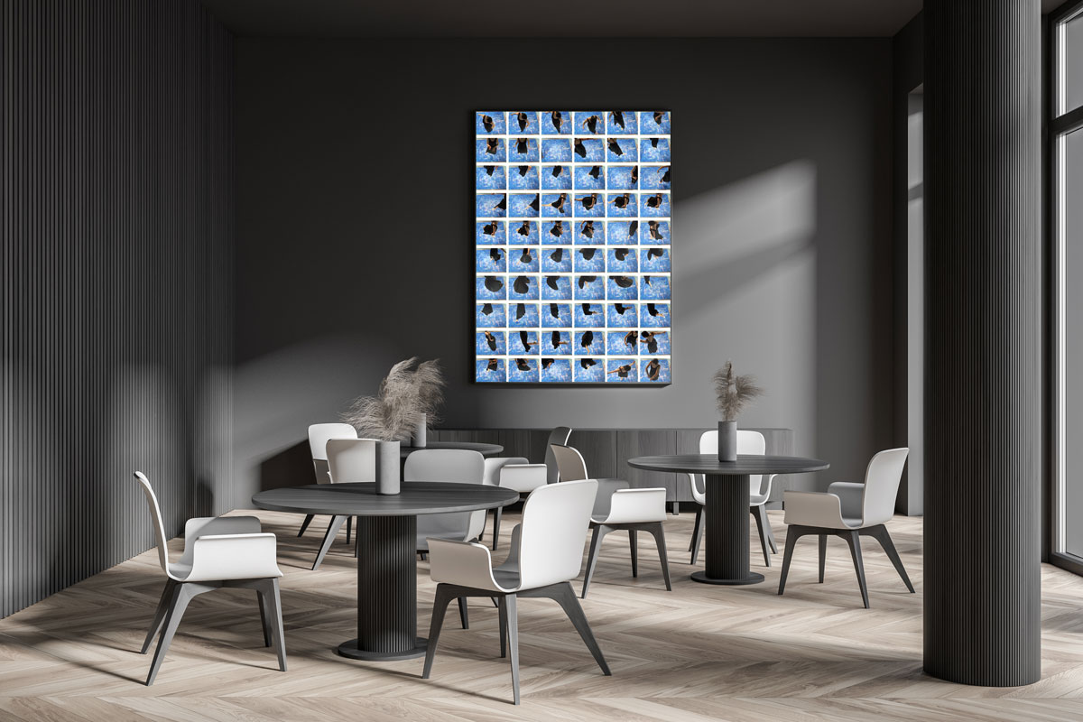 Art print creation process: The art prints are a collection of video footage screenshots captured through a camera attached to a crane, showcasing the dancer’s movements during the original canvas creation process and action painting live performance. Explore the elegantly flowing movements of ballet and read more about the art prints.